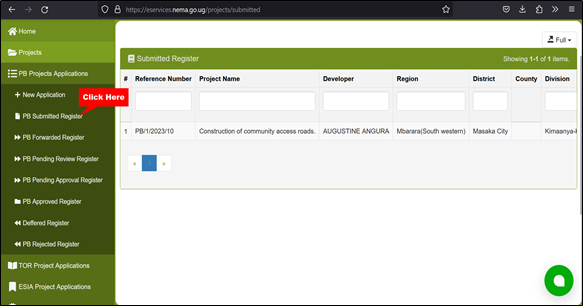 4. Click the “**PB Submitted Register**” text link and the system will display the PBs submitted into the system that are assigned to you.