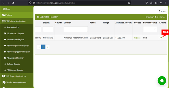 5. Locate and select the **PAID** for a project brief application for which you wish to forward for review by clicking on the “**view**” icon. This action takes you to the PB details page.